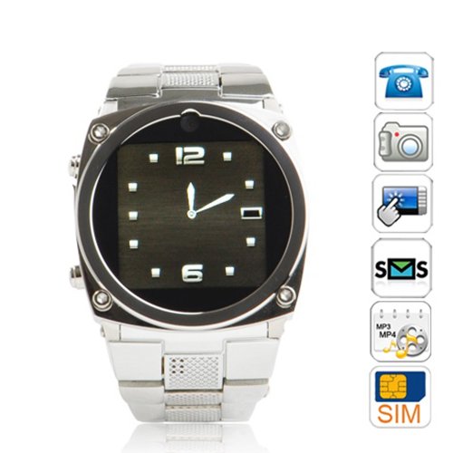 Try new single sim stainless steel watch phone with touch screen 1.6 inch display, bluetooth, video camera and multimedia player. You can easily use your wrist watch as a mobile phone. ![]() Specification: Band: Quad Band Network: GSM850/900/1800/1900MHz Card Slot: micro SD supports up to 16GB Internal: 128+64MB Alert Types: Vibration, MP3 ringtones Handsfree: Yes 3.5mm Jack: No Phonebook: 500 entries, Photocall Call Records: Yes GPRS: Yes EDGE: No 3G: No WLAN: No Bluetooth: Yes, v2.0 with A2DP USB: Yes, mini USB v2.0 Games: Yes Java: Yes Language: English, French, Spanish, Portuguese, Italian, German, Dutch, Czech, Greek, Russian, Turkish, Arabic, Greek Multimedia: MP3 player, MP4 player Organizer : Voice recording, Video recording Camera: 1.3mega pixels high definition camera Resolution: 240 x 240 pixels Battery Capacity Standard battery, Lithium-Polymer battery 370 mAh Stand-by: Up to 150 h Talk time: Up to 3 h Messaging: SMS, MMS, Email and IM Browser: WAP Dimensions: 44 x 58 x 14.5mm Weight: 150g Color: Silver Package List: 1xTouch Screen Watch Phone 1xBluetooth Headset 2xBattery 1xEarphone 1xUSB Bluetooth Charging Cable 1xUSB Watch Charging/Data Transfer Cable 1xPower Adapter 2xManuals - English